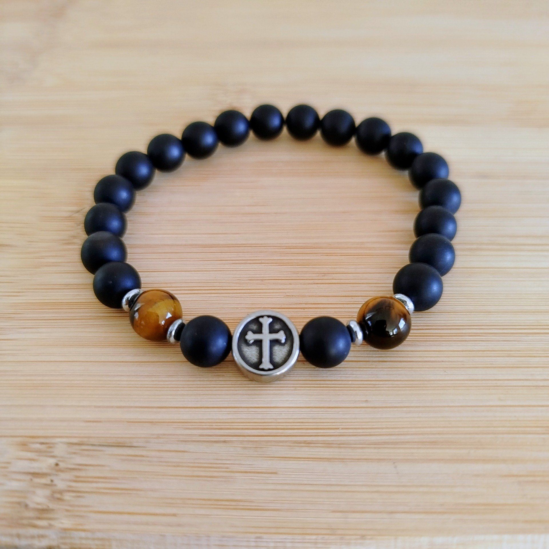 Bracelet homme Œil de tigre et Agate noire, croix acier inoxydable
