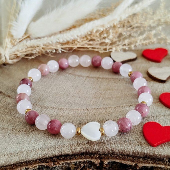 Bracelet cœur en nacre pierres quartz rose rhodonite