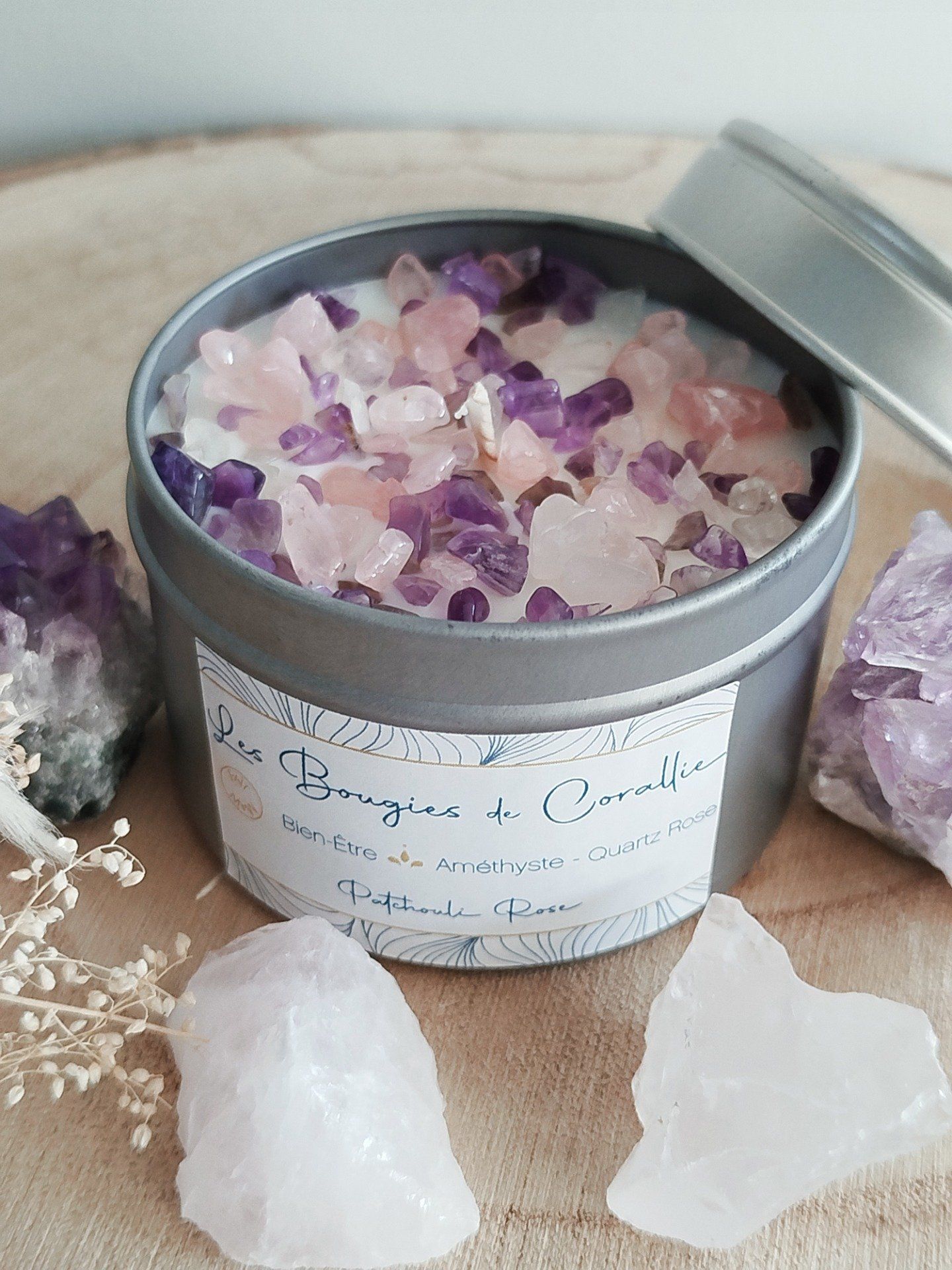 Bougie Bien-Être avec pierres Améthyste et Quartz Rose, bougie parfumée Patchouli Rose, bougie ambiance zen et cocooning