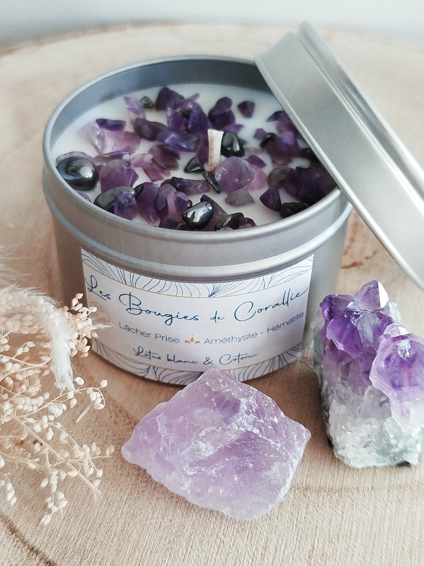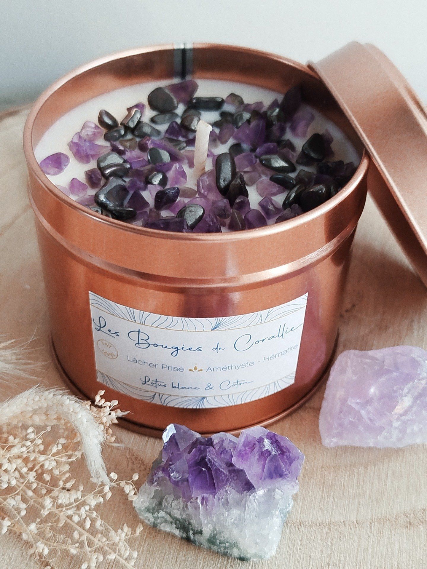 Bougie parfumée Lâcher-Prise, pierres Améthyste et Hématite ,Parfum Lotus Blanc et Coton, Bougie énergétique